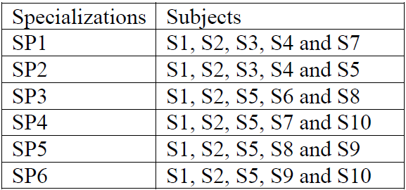 There are six specializations SP1, SP2, SP3, SP4, SP5 and SP6 in a postgraduate degree programme of a university. Each specialization has five specified subjects out of ten subjects S1, S2, S3, S4, S5, S6, S7, S8, S9 and S10. Specified subjects for specializations are given in the following table.